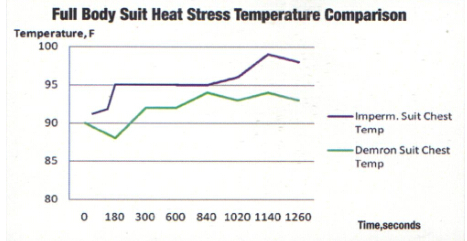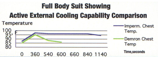 ?實驗條件:工作人員身穿不同防護服,以3.5英里/小時的速度在跑步機上慢跑10分鐘后測量全身防護服的溫度。藍色曲線代表通用防護服,綠色曲線代表使用Demron材料制成的防護服。