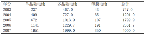 提高光電轉換效率和降低生產(chǎn)成本。太陽能光伏電池通常用晶體硅或薄膜材料制造,前者由切割、鑄錠或者鍛造的方法獲得,后者是一層薄膜附著在低價的襯背上。晶體硅仍是當前太陽能光伏電池的主流。晶體硅電池包括單晶硅太陽電池和多晶硅太陽電池。單晶硅電池的實驗室*高轉換效率可達24.7%,商業(yè)化電池效率為16%~20%。多晶硅太陽能電池的實驗室*高效率也超過了20%,商業(yè)化電池效率為15%~18%。除效率外,電池的厚度也很重要。降低硅片厚度是減少硅材料消耗、降低晶硅太陽電池成本的有效技術措施。硅片的平均厚度已從2003年的0.23mm減小到2007年的0.18mm。下表為2003—2007年各類太陽能產(chǎn)量MW
