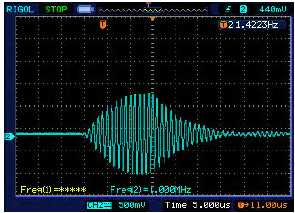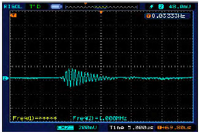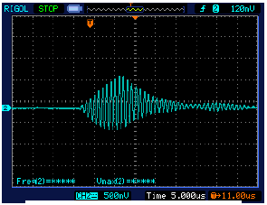 在超聲波流量測量時(shí),首先要對換能器進(jìn)行驅(qū)動(dòng),激勵(lì)換能器產(chǎn)生振蕩并發(fā)出超聲波信號,以下是分別采用1個(gè)驅(qū)動(dòng)脈沖、10個(gè)驅(qū)動(dòng)脈沖和15個(gè)驅(qū)動(dòng)脈沖作為換能器的激勵(lì)源,圖2是1個(gè)驅(qū)動(dòng)脈沖時(shí),接收端換能器所接收到的波形。可以看出,當(dāng)一個(gè)脈沖驅(qū)動(dòng)時(shí),所接收到的波形比較微弱,波形很不規(guī)范。圖3是10個(gè)驅(qū)動(dòng)脈沖時(shí),接收端換能器所接收到的波形。波形形狀得到明顯改善。圖4是15個(gè)驅(qū)動(dòng)脈沖時(shí),接收端換能器所接收到的波形。