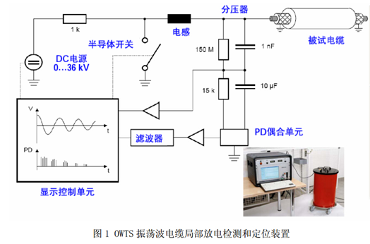 電力電纜由于其電容量大,很難在現場進行工頻電壓下的局部放電檢測。過去充油電纜采用直流試驗,可以大大降低電源的要求。但對XLPE電力電纜,由于其絕緣電阻較高,且交流和直流下電壓分布差別較大,直流耐壓試驗后,在XLPE電纜中,特別是電纜缺陷處會殘留大量空間電荷,電纜投運后,這些空間電荷常造成電纜的絕緣擊穿事故。采用超低頻(0.1Hz)電源進行試驗,要求試驗時間長,電纜絕緣損傷較大,可引發電纜中新的缺陷。振蕩波電壓是近年來國內外研究較多的一種用于XLPE電力電纜局部放電檢測和定位的電源。該電源與交流電源等效性好,作用時間短、操作方便、易于攜帶,可有效檢測XLPE電力電纜中的各種缺陷,且試驗不會對電纜造成傷害。OWTS振蕩波電纜局部放電檢測和定位裝置如圖1所示。檢測時可以靈活施加0-28kV的直流電壓,合上半導體開關后,被試電纜與電感產生阻尼振蕩。該裝置可以檢測的電力電纜電容范圍為0.05uF-2uF。