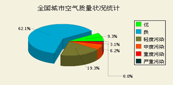 7月7日全國城市空氣質量日報對全國城市空氣質量狀況的檢測結果做了詳細的介紹,其中監測指標為空氣質量指數,即air quality index(AQI)。其中,3.1%的城市為重度污染,6.2%的城市為中度污染,19.3%的城市為輕度污染,62.1%的城市空氣質量為良,僅有9.3%的城市空氣質量為優。