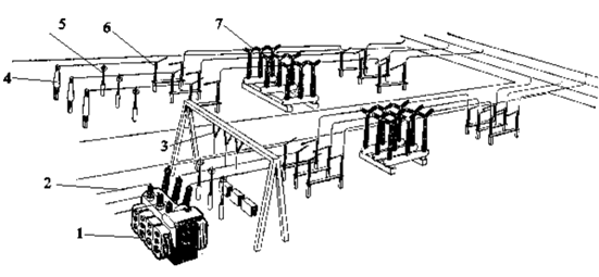 圖1 1—變壓器;2—導線;3—絕緣子;4—互感器;5—避雷器;6—隔離開關;7—斷路器