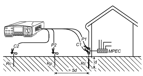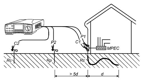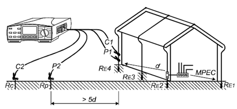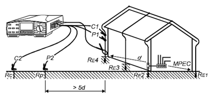 電壓及電流測試桿的安裝位距離接地系統比較遠,因此接地點可看做為一點。其中d為接地系統中,相距*遠的兩個接地電極的距離。電流探頭的距離至少為5d。