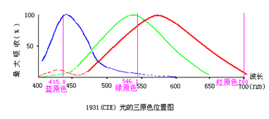 1931年國際照明委員會(CIE)規(guī)定紅、綠、藍三種原色光的波長分別為:700nm、546.1nm、435.8nm。為了理論闡述上的方便,我們把這三種原色光的位置標記在“視網(wǎng)膜視錐細胞的光譜吸收曲線圖”上,(見下圖)。在這張
