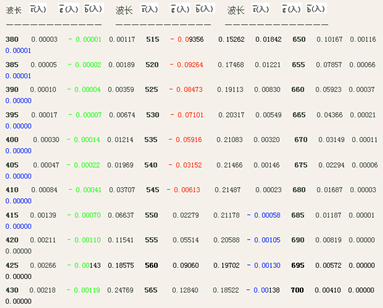 bg(G0)-Cg(G0)。此時,輔助用的“綠原色”光的量g,*是該段光譜色三刺激值“負值”的大小。查表可知,它的*大值發(fā)生在425nm。數(shù)值大小是0.00143。