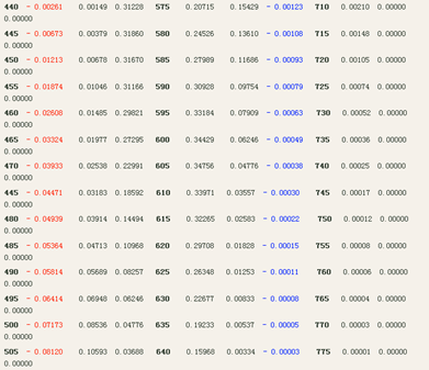通過這一段分析可以看出,從546.1nm到690nm這一段,b的數(shù)量是由0開始增加,之后又減少,到了690nm處的時候減少到0。顯然b在這區(qū)間內(nèi)肯定要有一個*大值。現(xiàn)在,我們來看一下“光譜三刺激值”表中的546.1nm到690nm這一段,其中起輔助作用的光的“藍原色”的數(shù)量的變化(即,藍色三刺激值的變化),不*是這樣的一種情形嗎?它有一個*大值*發(fā)生在545nm處,數(shù)值的大小是0.00138(在表中我們對這個*大值中的138標了黑色,目的為了便于重新查找它。至于這個“刺激值”的負號來源,也*無需再作解釋了)。